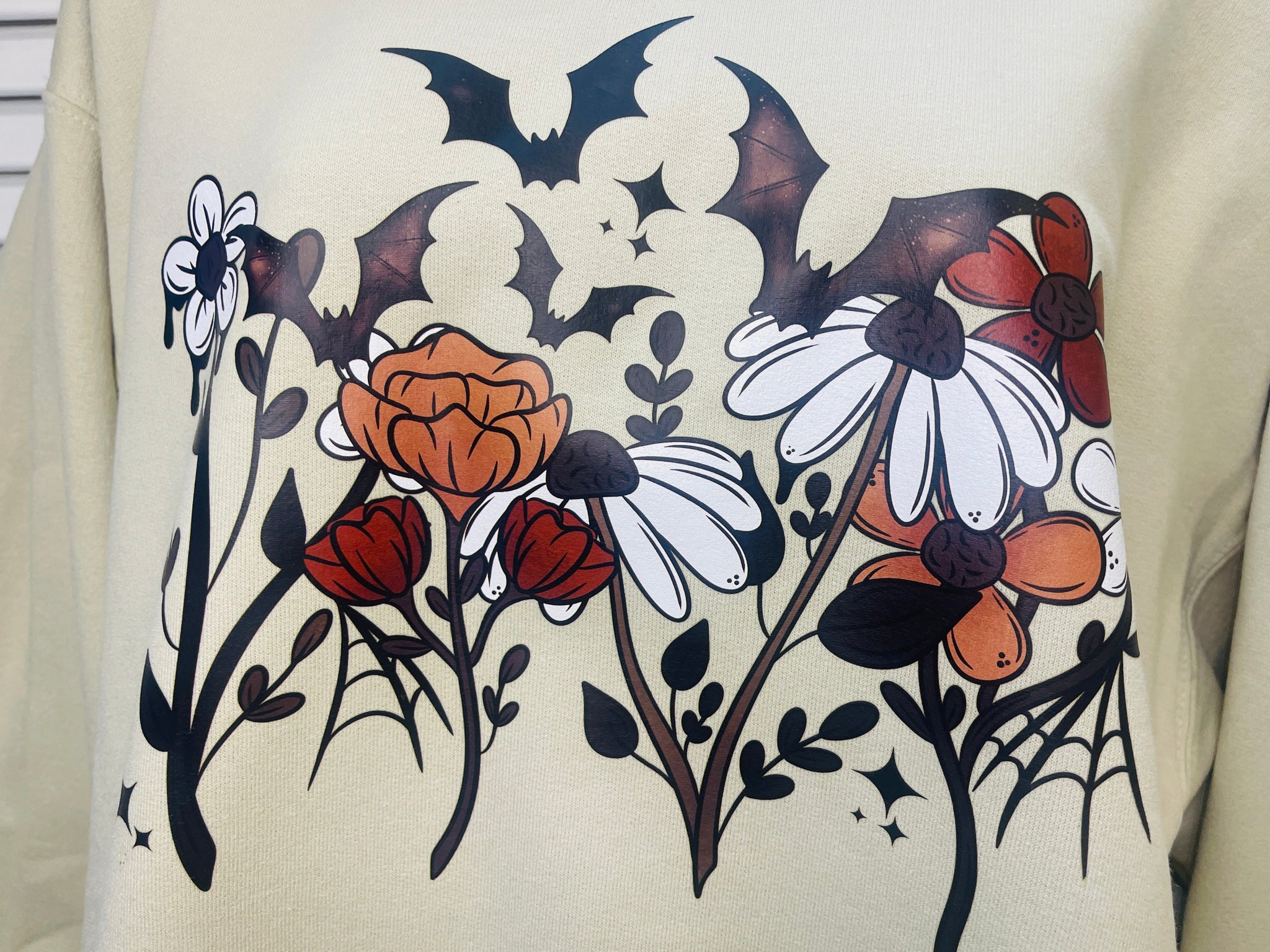 Soft comfy crew neck with a fun fall floral design both on the chest and the left arm.
